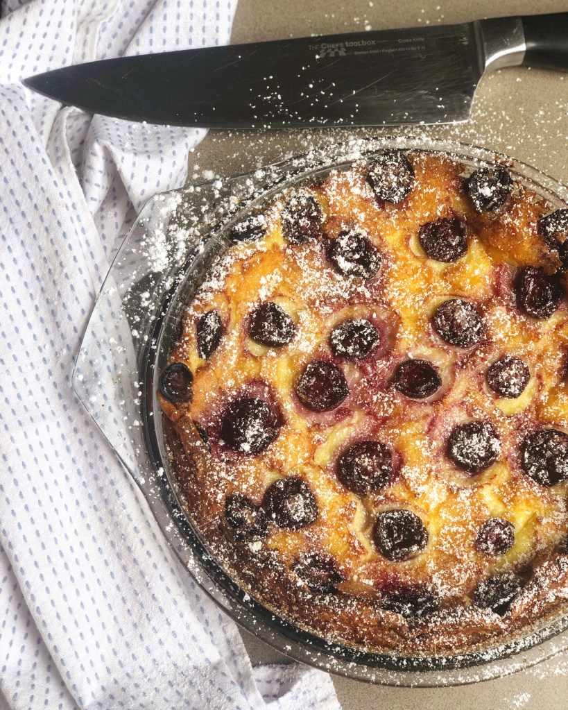 4. Place cherries on the bottom of the baking dish, skin side down. Pour into the prepared baking dish and sprinkle with remaining sugar. Bake for about half an hour, until just set but still a bit wobbly.