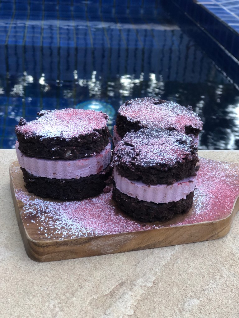 - To assemble the sandwiches, get your favourite shaped cookie cutter and cut out as many brownie shapes as you can get and do the same with the ice cream. Place one ice cream shape between two brownie shapes and dust with icing sugar.