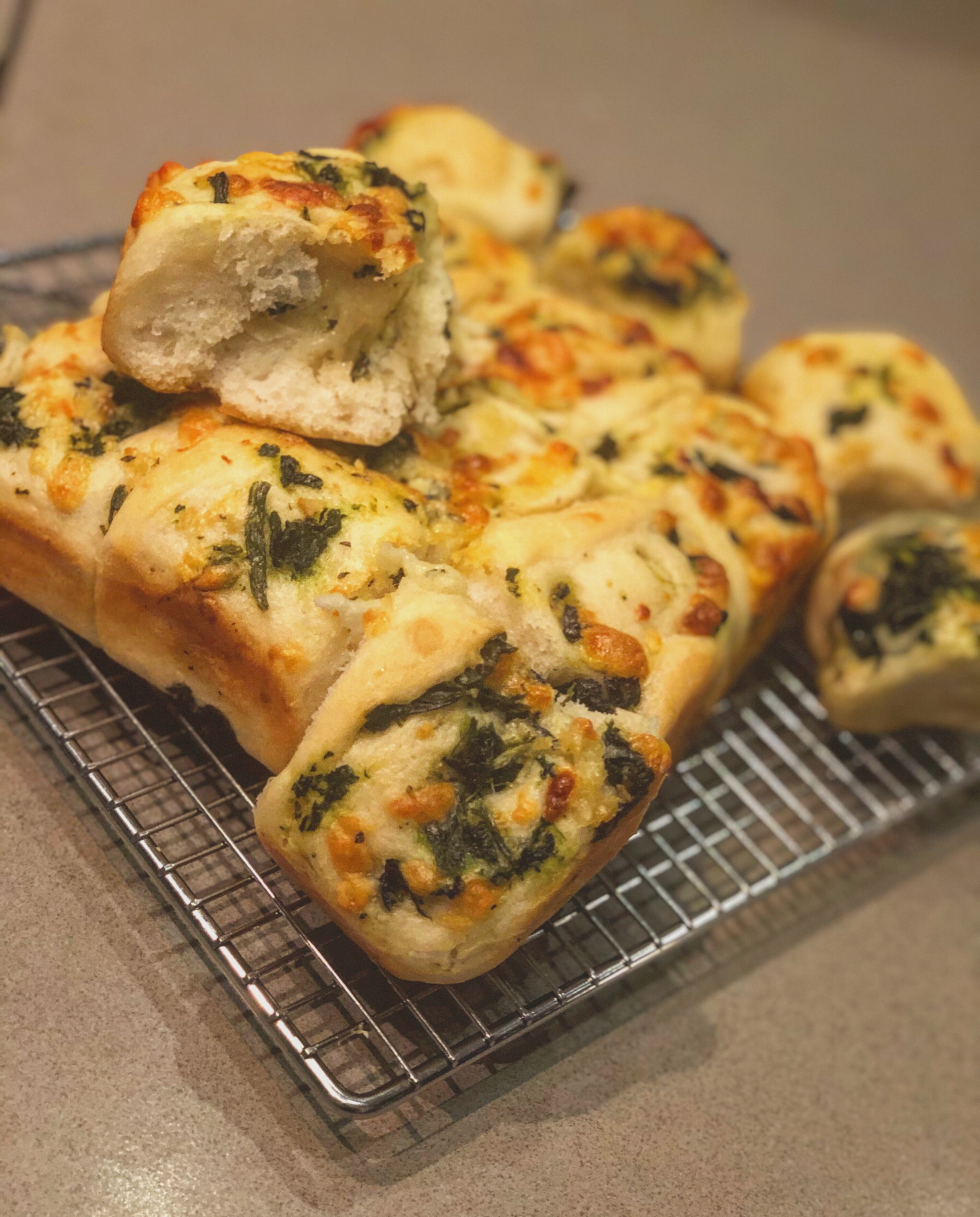 3. Once dough has risen, take out of the bowl and roll into a rough square. Sprinkle the cheese and spinach mixture over the dough then roll into a sausage shape. Then cut into 1 inch diameters.