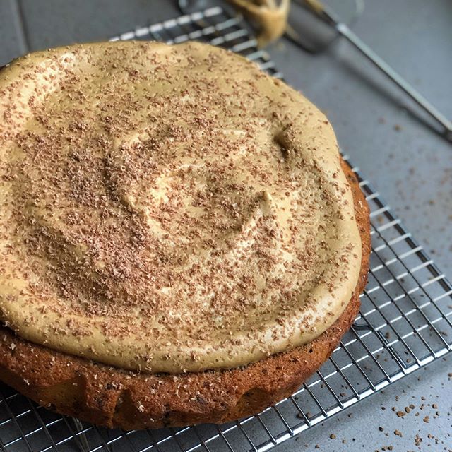 - While cake is cooling, make the icing. In a bowl, add the 4 tbsp of instant coffee, granulated sugar and boiling water. Using an electric mixer, mix on high for about 5 mins or until coffee is light, fluffy and resembles meringue. Spread over completely cooled cake.