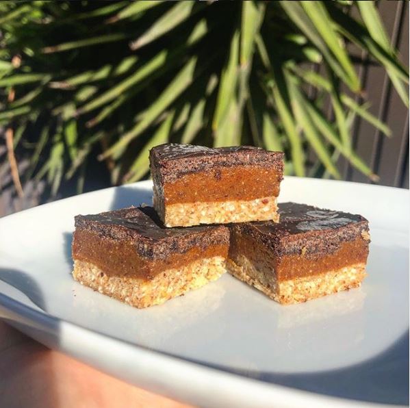 Since beginning my Nutrition degree, I’ve tried creating my favourite dessert recipes but in a healthier version (but don’t get me wrong, I still love to indulge in ‘real desserts’ with sugar). While they still contain loads of kilo-joules, they’re not filled with bleached sugars and instead include a natural form of sugar like organic maple/date/rice bran syrup. These little delights are going to provide you with extra sustenance that your body will LOVE you for. The nuts in the base provide you with omega-6 fatty acids which can help stimulate skin and hair growth, maintain bone health, regulate metabolism, and maintain the reproductive system. The dates provide the extra sweetness and chewiness to mimic a caramel flavour while both the dates and cacao provide you with antioxidants!