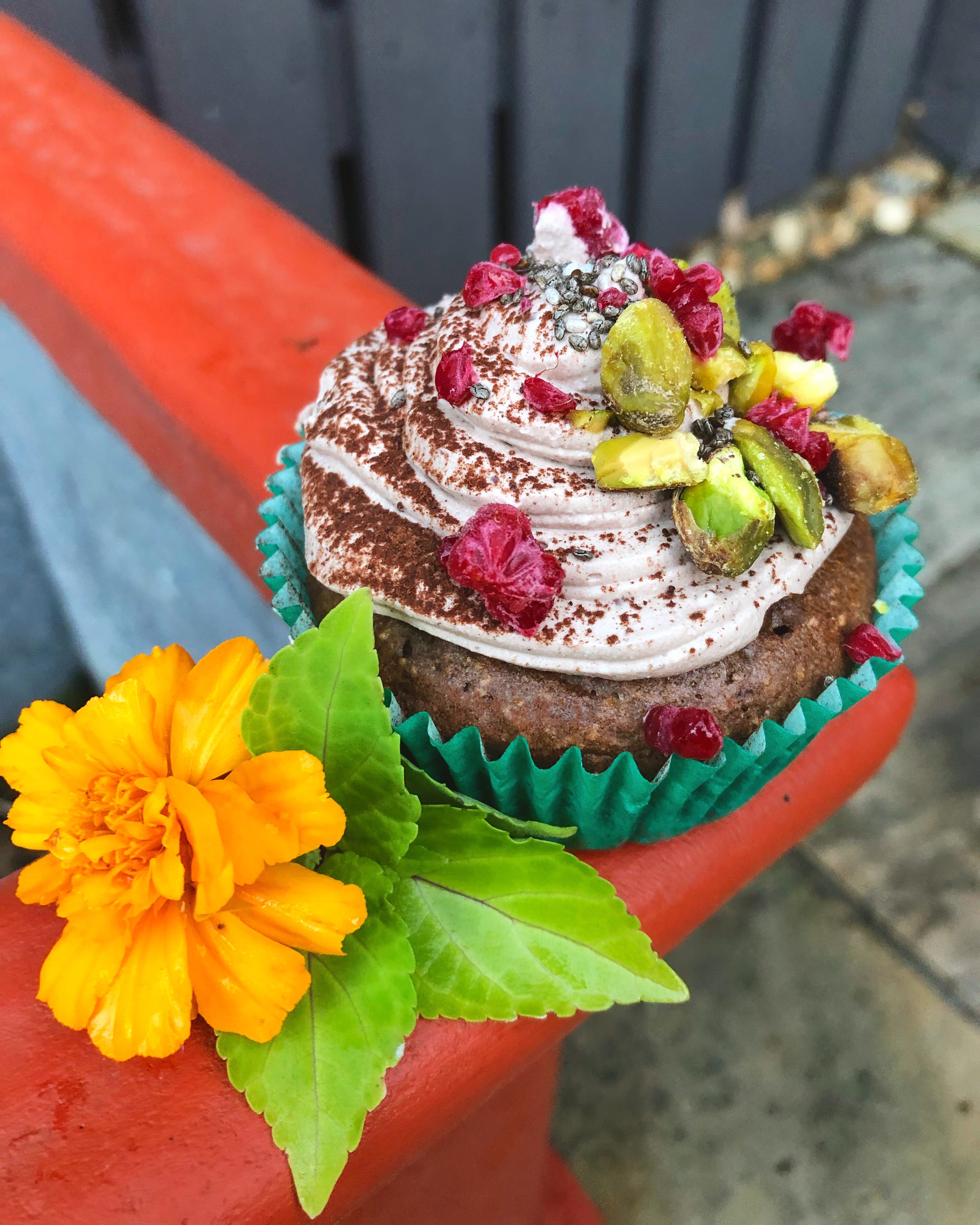 Pipe onto cupcakes and decorate with whatever you like, I used cocoa powder, pistachios and raspberries.